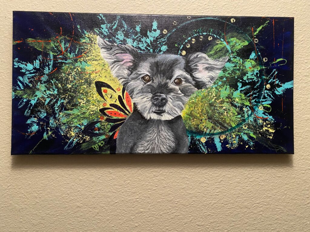 I am an artist living in Oakcliff. I started painting pet portraits a few years ago when my beloved dog Keebler crossed the rainbow bridge. I started off painting other peopleโs pets to help me grieve my own. I have only recently been able to paint him and I do think it is my best work yet. I have included a photo of this piece. I would like to offer one custom pet portrait for this event.