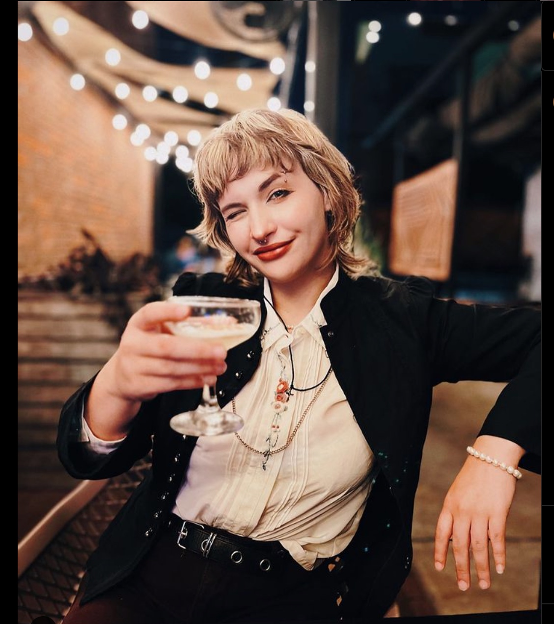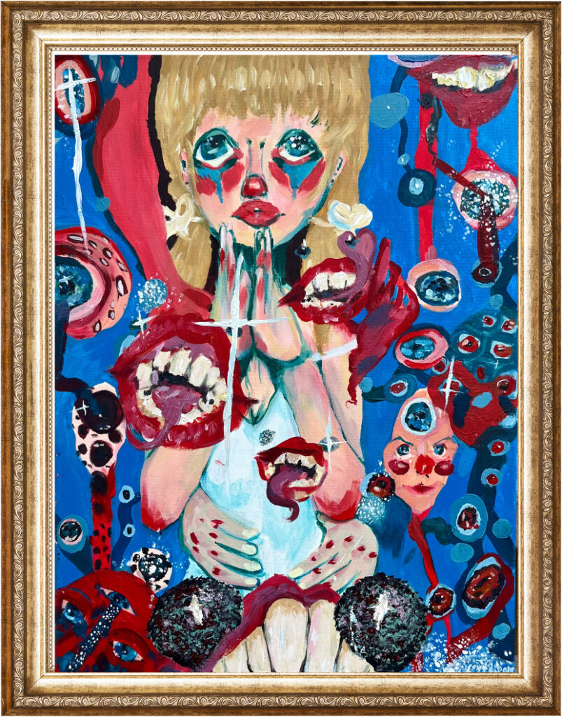 Iโm EJ, I am a nonbinary queer person that has lived in Dallas my entire life. My passions are art and autistic activism/education and I am an advocacy team member for the S.T.I.M. Project, an autistic-led nonprofit focusing on accommodation/coping tools for underprivileged kids and adolescents. I am autistic, and as a child, I struggled with language. I had a disorder that jumbled my words to a point I could not be understood by anyone. I remember when I was 7 and I was talking to my mom about being mad about not being in front on a water slide that day. When I went to bed that night, I didnโt think anything of, it but I heard my mom start to cry. Years later I found out that was the first back-to-back conversation I have ever had. As an adult, I would still say that art is an easier way of expressing my emotions. I put what Iโm feeling in the painting and not really know what Iโm making, but then itโs done and I know. The piece I want to share with the world is โmeat: from both perspectivesโ. It is a representation of my current relationship with social media and my experiences and reactions to strangersโs judgments of me and my primarily identify-based content online.